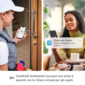 La funzione di ospite pre-approvato consente di inviare una chiave ospite ad amici e parenti, in modo che possano entrare nell'edificio utilizzando il loro smartphone. Sia che desideri che abbiano accesso in determinati giorni, a orari prestabiliti o 24 ore su 24, puoi gestire la programmazione della chiave ospite o revocare l'accesso nell'app Ring in qualsiasi momento, in modo da avere sempre il controllo.