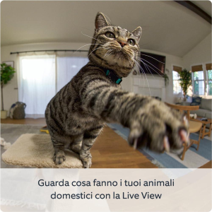 Saluta i tuoi animali domestici, mandali via dal tavolo o fai loro compagnia. Con Pan-Tilt Indoor Camera, è facile vedere, ascoltare e parlare grazie all'audio e al video in diretta.