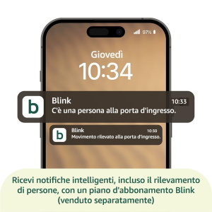 FUNZIONALITÀ AVANZATE: se acquisti un piano d'abbonamento Blink, ricevi avvisi ogni volta che viene rilevata una persona e hai a disposizione funzionalità come Live View estesa o Momenti Blink. Alcune funzionalità sono disponibili esclusivamente con il piano Plus.